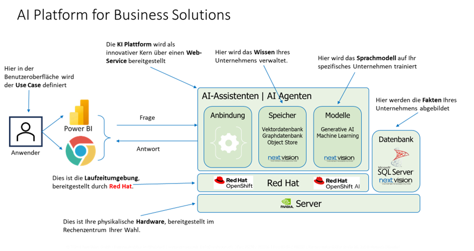 The foundation is an open AI platform based on Red Hat OpenShift and Red Hat OpenShift AI, complemented by a business-oriented architecture developed by Next Vision. This architecture includes, among others: